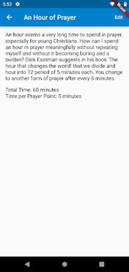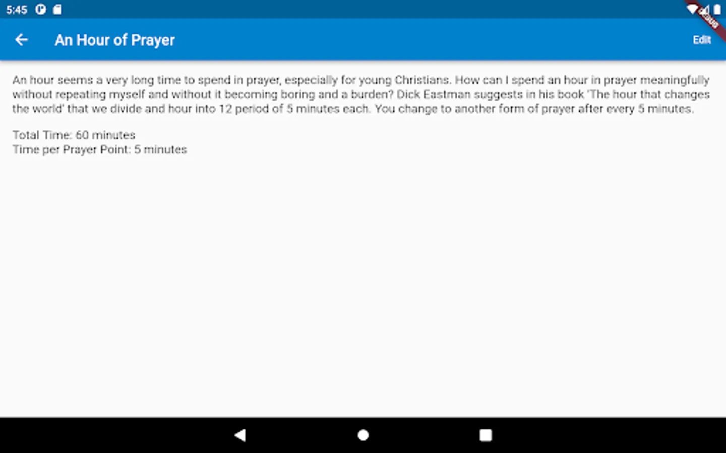 The default timer is set to use Dick Eastman's model for spending an hour of prayer.