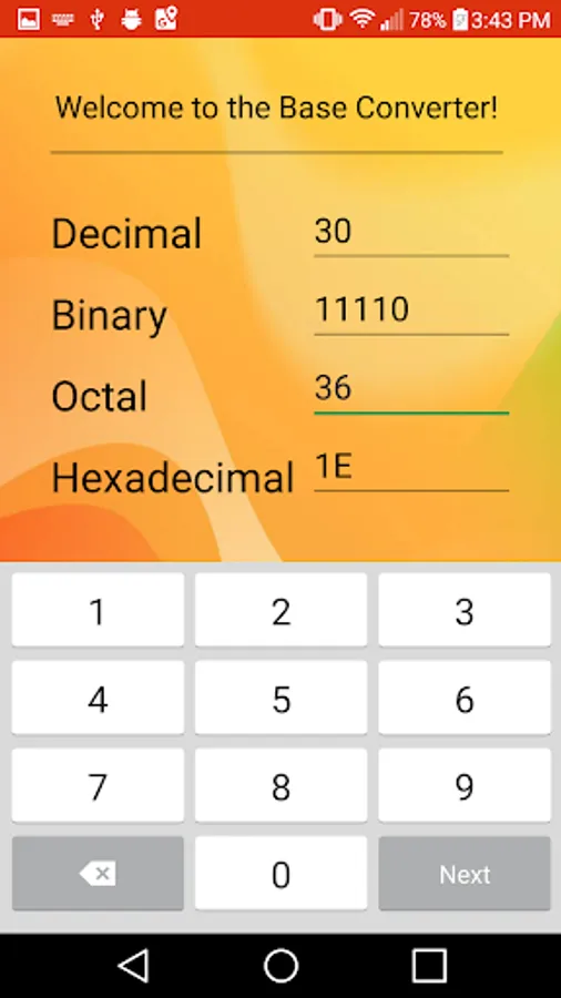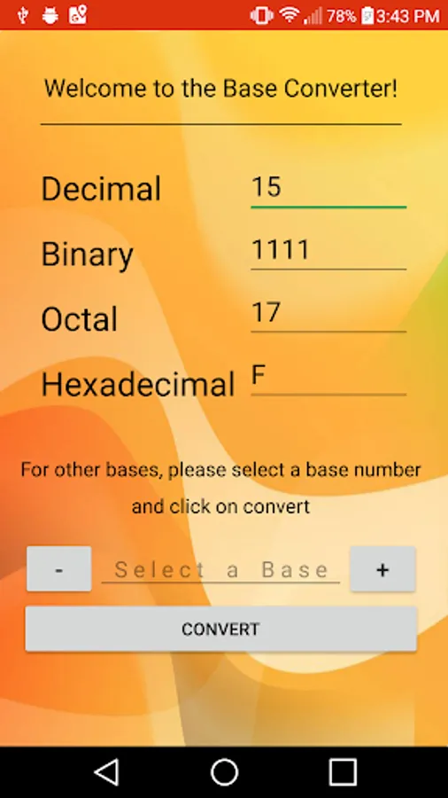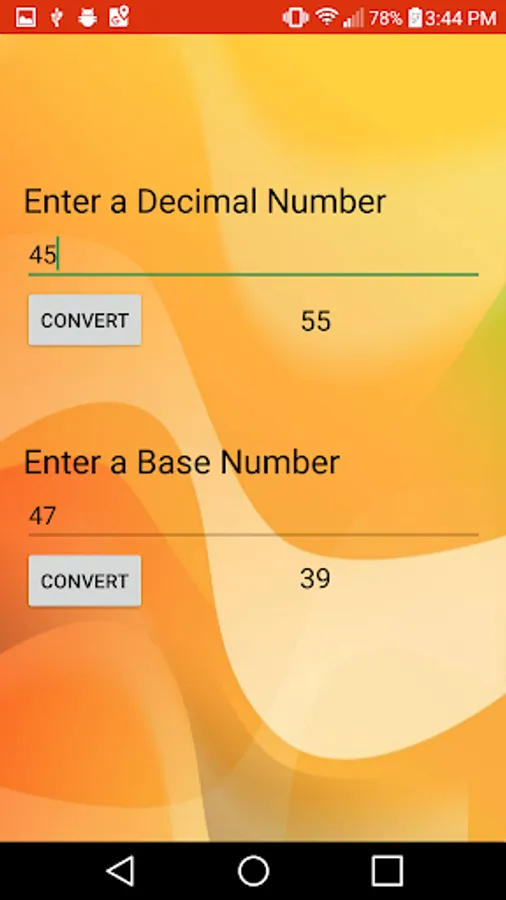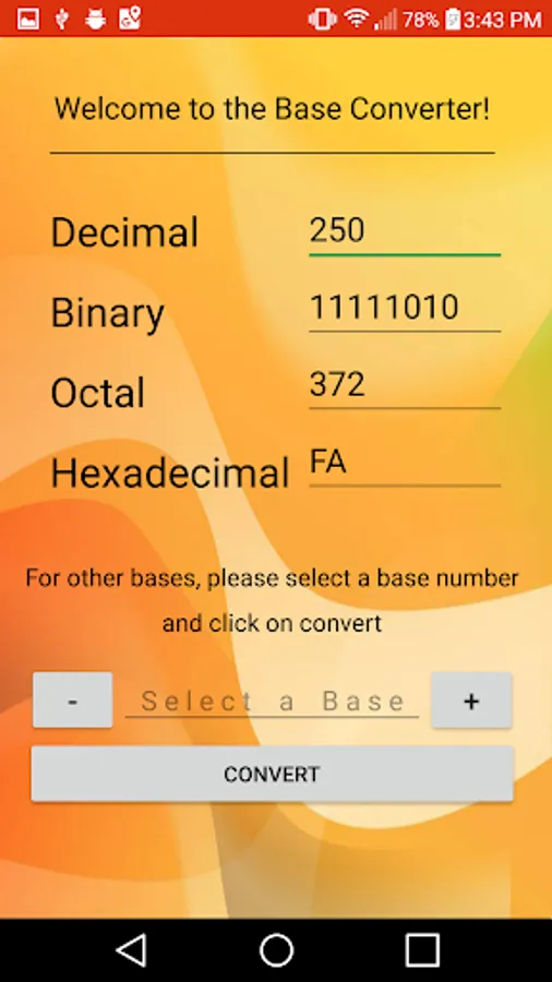 This app converts numbers to 35 different bases. The operation is possible in both base to base direction. The main menu converts hex, octal, binary, and decimal. And the other menu allows to convert to other 35 bases