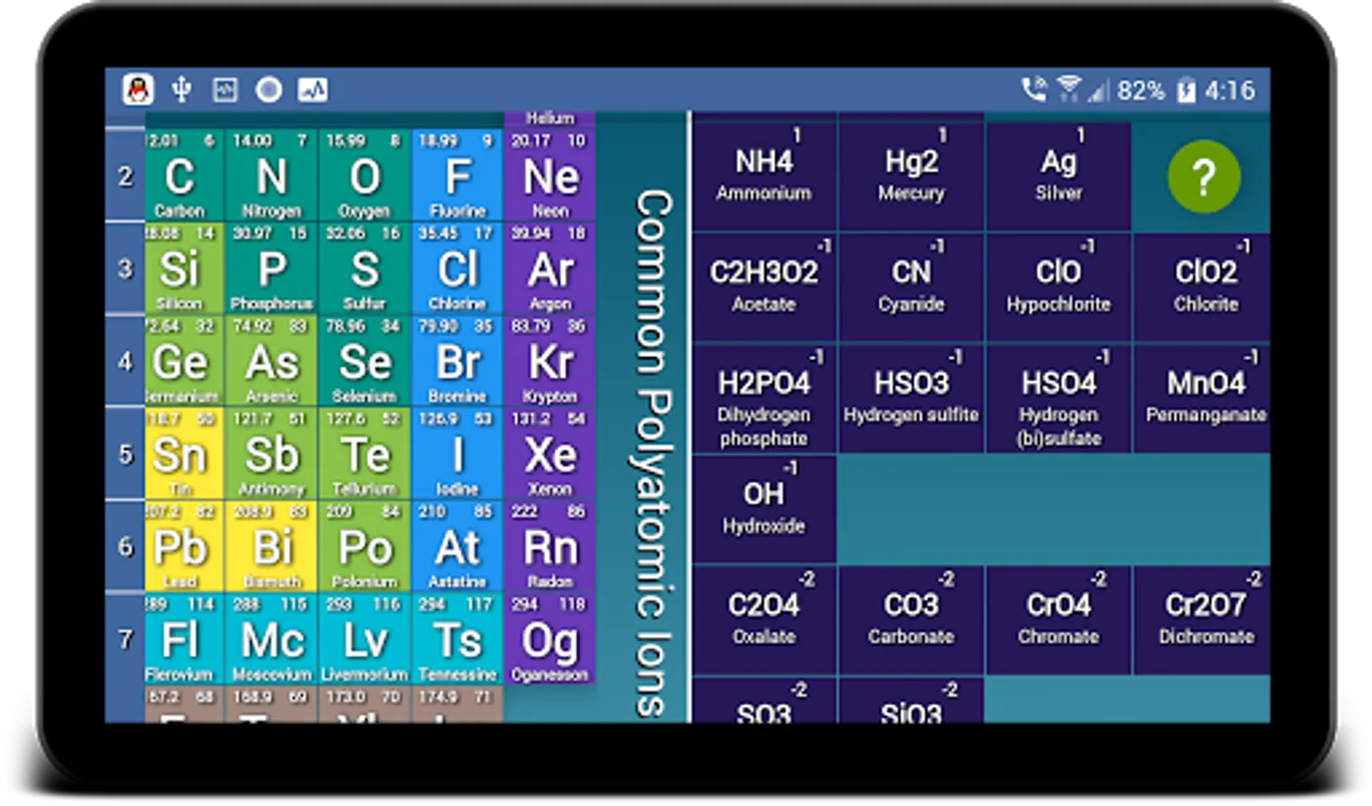 Periodic Table Tools is a free software for Android devices that includes a Standard Periodic Table and a Table of Commonly Used Polyatomic Ions.