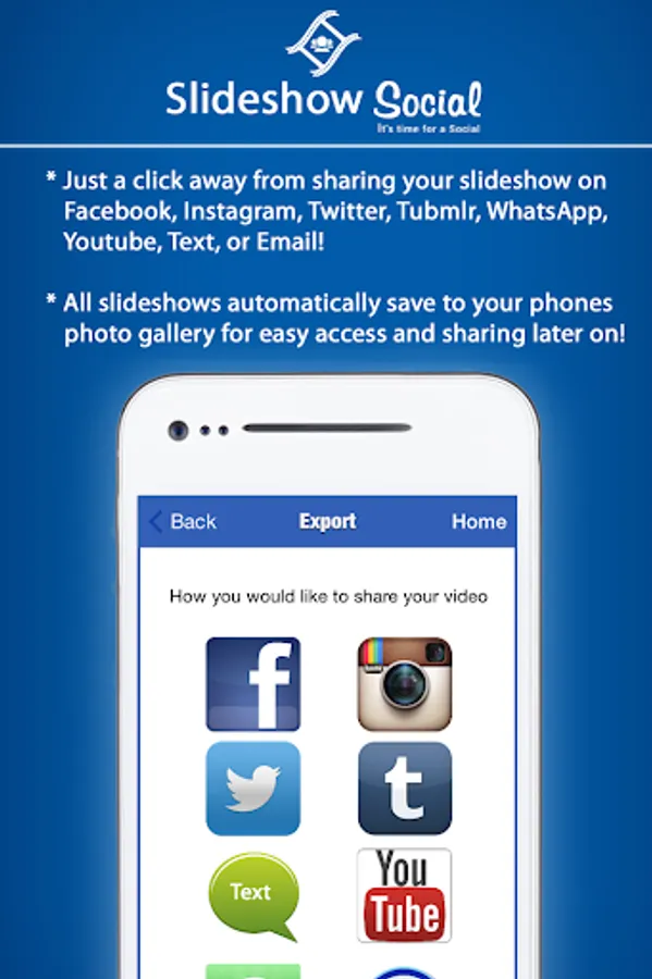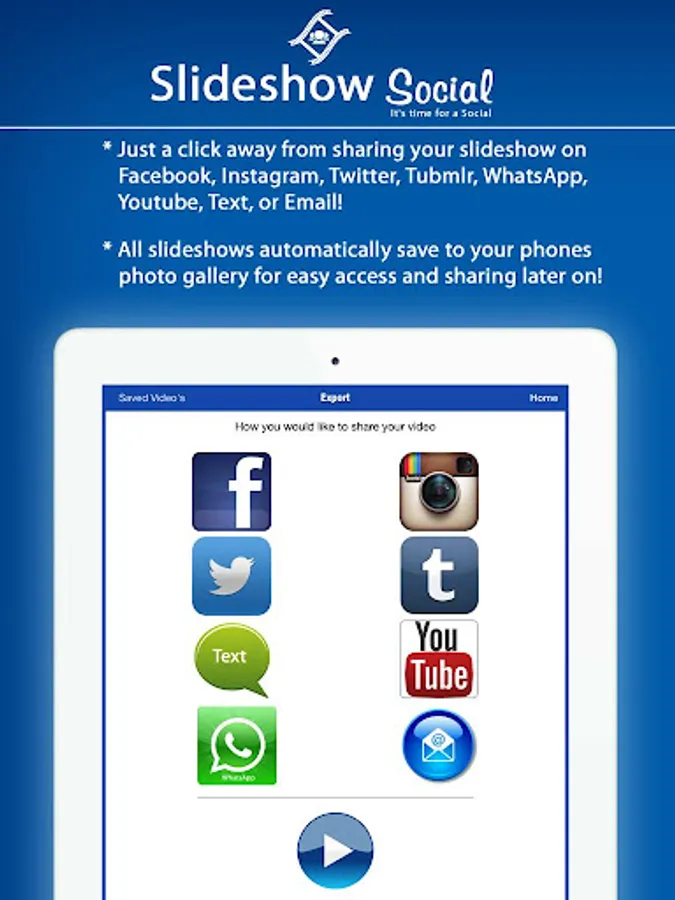 * Share videos on Facebook, Instagram, WhatsApp, Tubmlr, Email, Text, or Twitter (coming soon)
