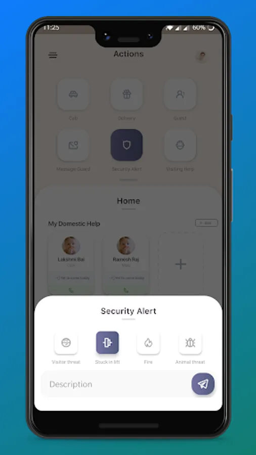 Security Alert : You can alert the guard about the security with the description to the guard like visitor threat, struck in lift ,fire alarm or even animal threat.