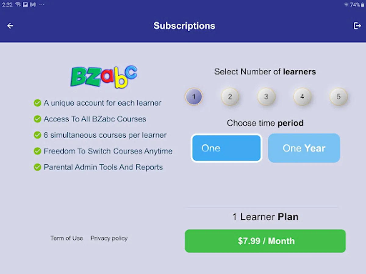 The BZabc app is an all-in-one tool for parents, allowing them to complete tasks such as registration, enrolment, and subscription purchase. For districts, schools, and teachers, admin tasks can be performed on the BZabc.tv website. Teachers can also use the app to manage and enable their learners. In addition, authors have the opportunity to use the Pubtool to place their courses and content on BZabc on a consignment basis. If you are interested in learning more, don't hesitate to contact us.