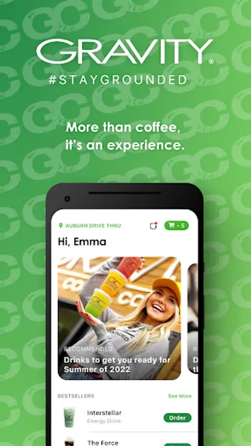 The Gravity App is the most convenient and exciting way to order ahead for pickup. Rewards are built right into the App, so you earn points as you go towards free drinks. Explore features such as: