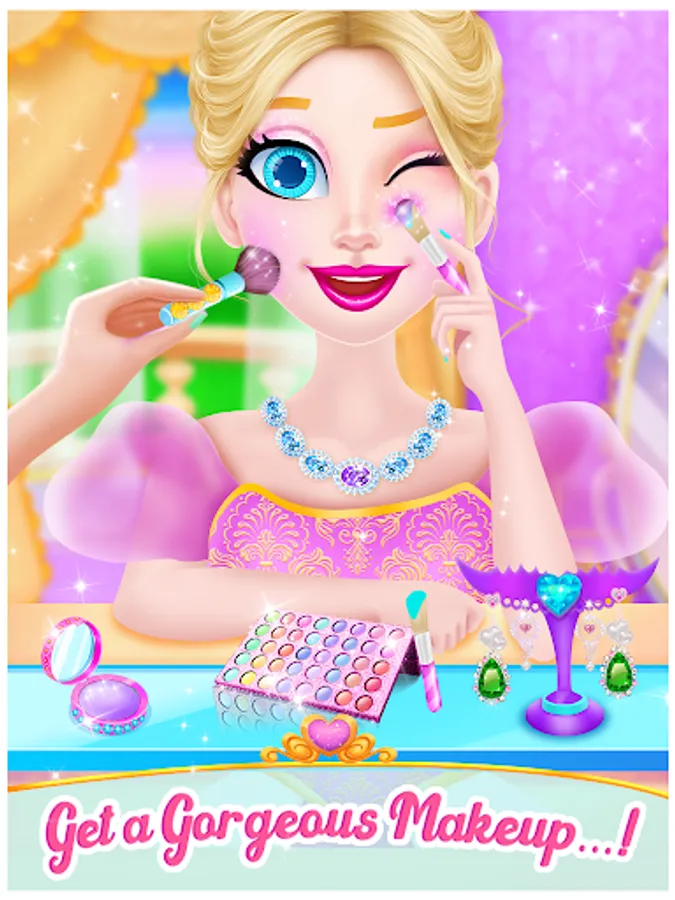 Let's Help Princess with her wedding day So she can Look gorgeous at her Grand wedding. Use Makeup accessories Like Lipstick, eyeshadow, eyeliner, blush. Try different hairstyles to match her wedding dress. Choose from a collection of a variety of earrings and necklaces. Even Try different Wedding dresses and select which suits her best. Princess is Not complete without her crown so select a wedding crown from a variety of crowns.