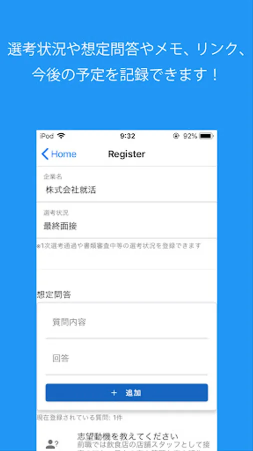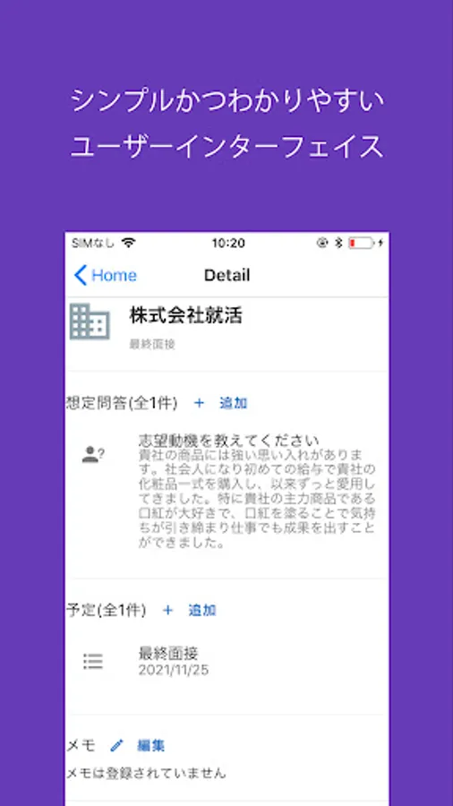 The job hunting manager can manage information about each company, expected questions and answers in interviews, and schedules! It is an essential app to lead a better job hunting life!