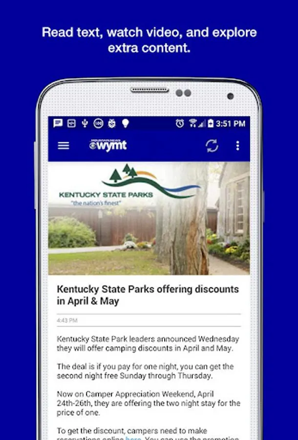 It’s the Eastern KY news experience you’ve waited for! Catch news, sports, and weather anywhere with the WYMT app for Android. Share content by email, text, Twitter or Facebook. Whether it’s severe weather or sports scores, the WYMT app for Android keeps you in-the-know while you’re on-the-go!