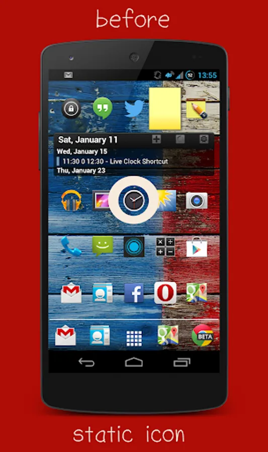 You can then remove your old, static alarm clock icon. Tapping on the new icon will launch your stock alarm app.