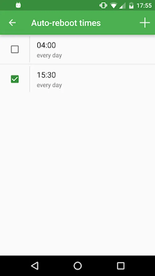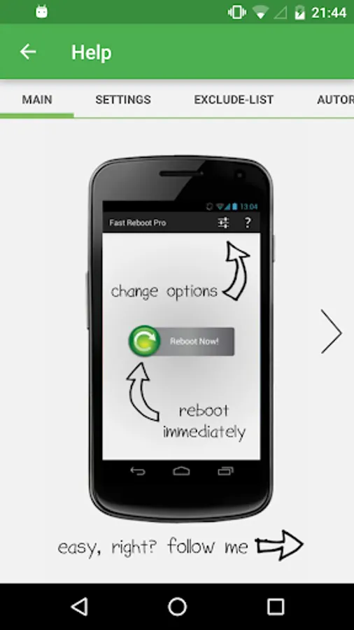 Fast Reboot Pro now includes an option to automatically perform a "fast reboot" every time you unlock your device (i.e. when you turn it back on from sleep and "slide" to unlock). This way, your phone will _always_ be as fast and responsive as possible! In addition, you can now schedule a fast reboot so that your phone is fast rebooted automatically at a certain time each day (configured by you, e.g. 4am when you're least likely to be using your phone)