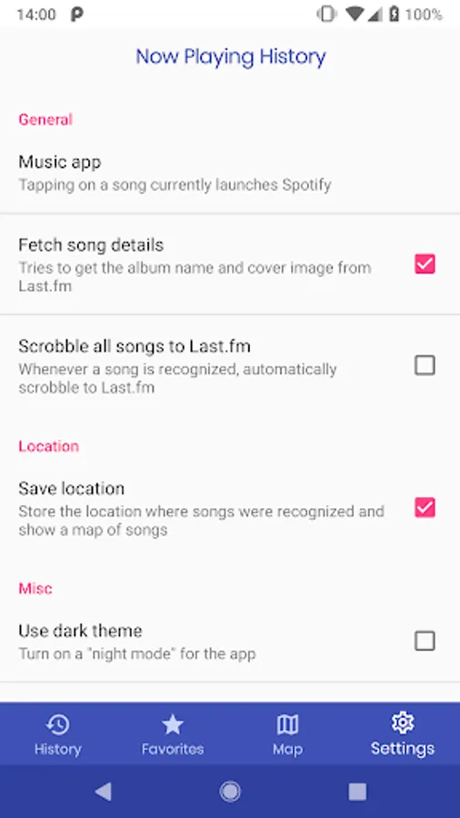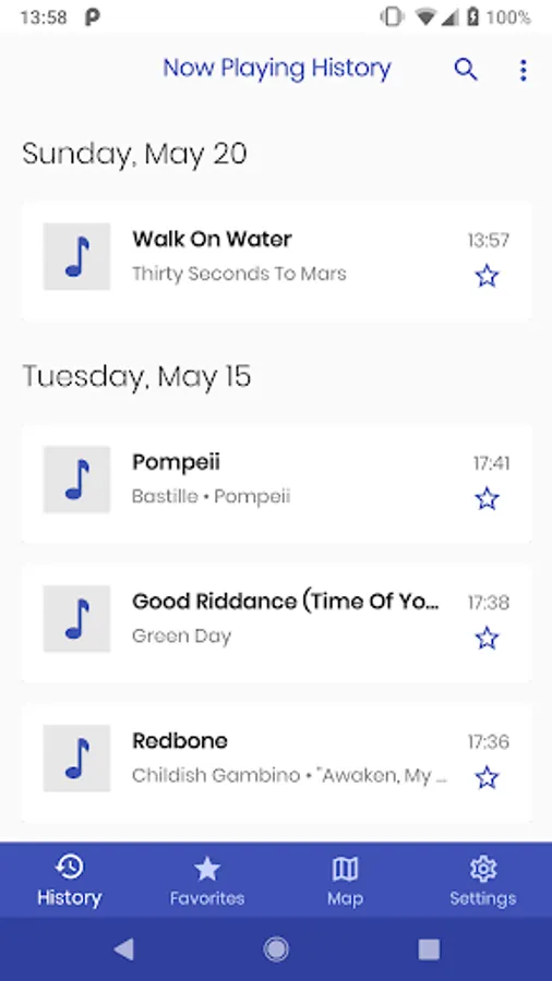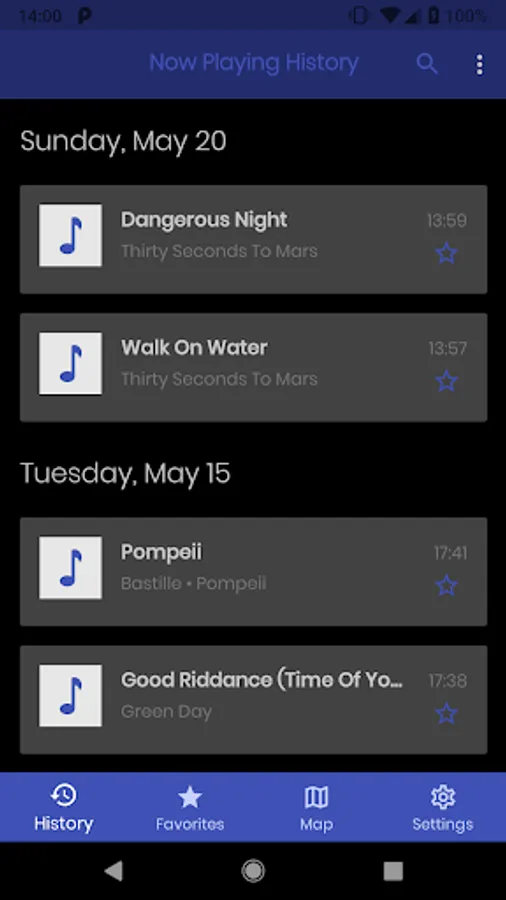 "Now Playing History" shows a history of all the songs you've listened to, sorted by date. Never miss a song again! You can tap on an entry to listen to the song in your favorite music player (customizable) and mark individual songs as "favorite". The app can optionally fetch additional details (such as the album name and album cover) for each song. An optional "map"-feature allows you to see where you've listened to each song. Explore where you've listened to the songs in your history, go back in time to see the playlist of your favorite night club, or reminisce about your last concert's set list.