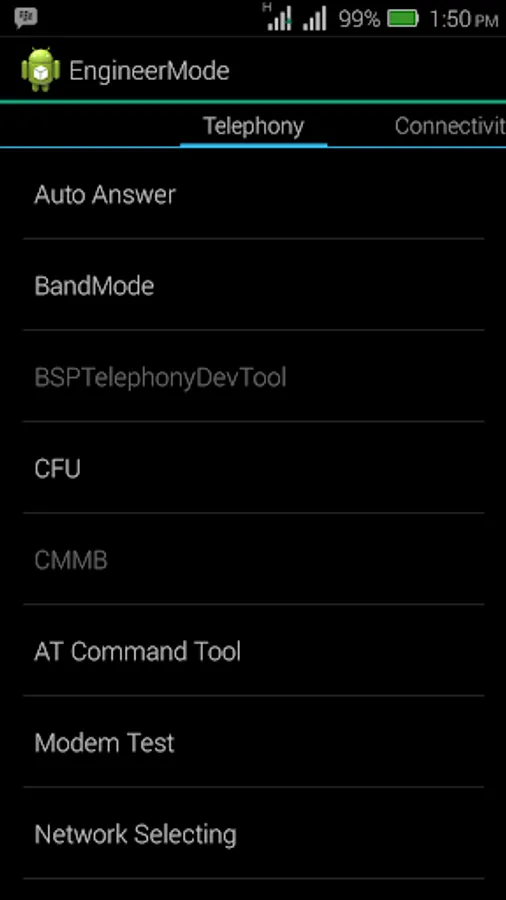 * USB, otg, sensor, video, location settings, battery log, mtklogger, touchscreen, uart/usb switch, band mode, antenna test, at command tool, AMR - WB on/off. etc