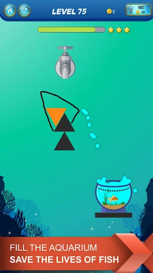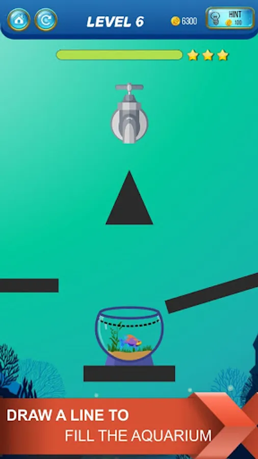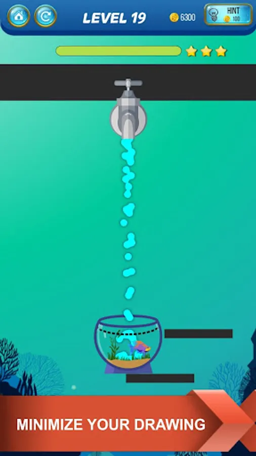 * Start a game you will loaded with new level, you have to do is carefully draw lines and make a clear path to spill water in aquarium, you can use your own logic to solve the puzzle your goal is to fill a water in Aquarium above the Dashed line.