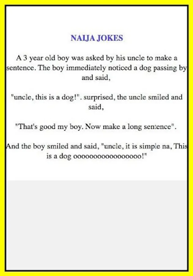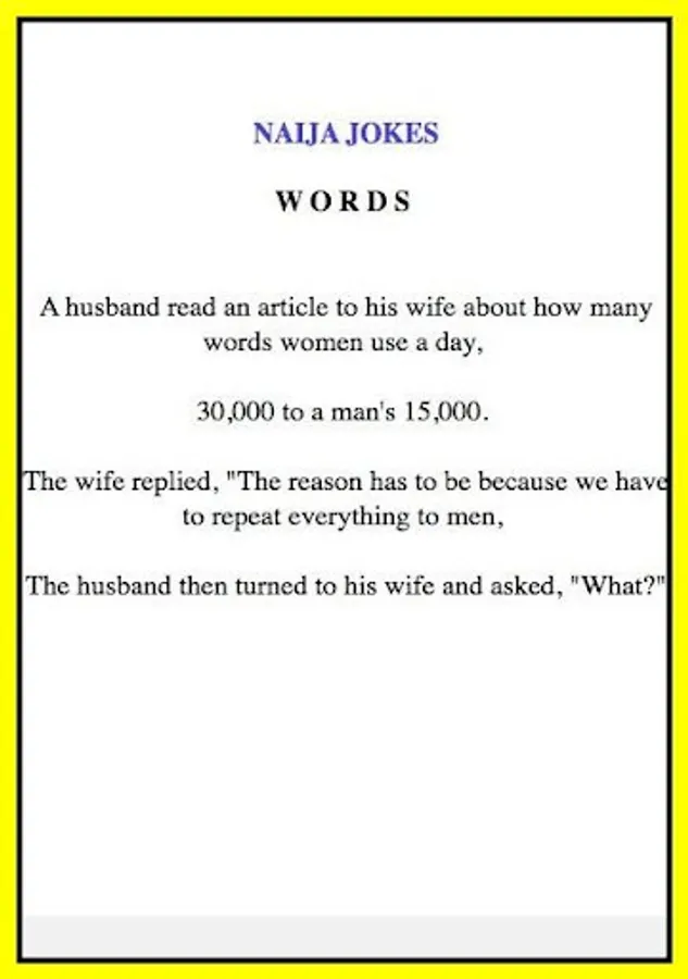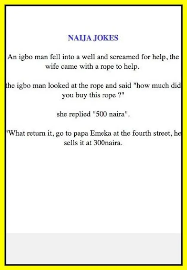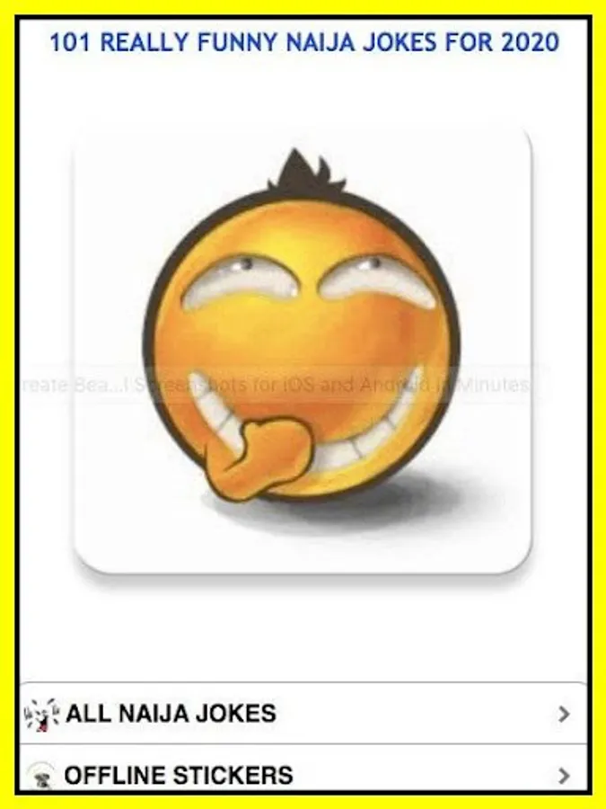 Get the best of Naija Jokes here :-) Awesome jokes to make your day. We love Nigeria :-) We hope that this simple Nigeria jokes app will make you laugh. Make your life the best ever.