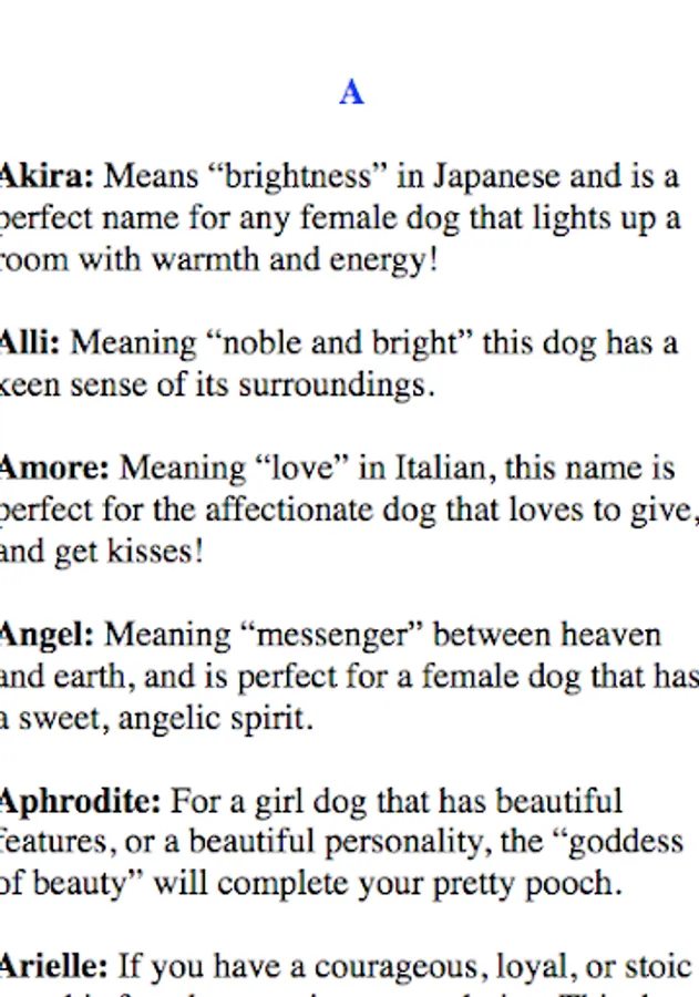 Find 500+ awesome girl dog names app for your beloved dogs or puppy. Get the best name for them now ! We hope you like it. Famous example of the unique female puppy names are Abby, Bella, Baby and many more.