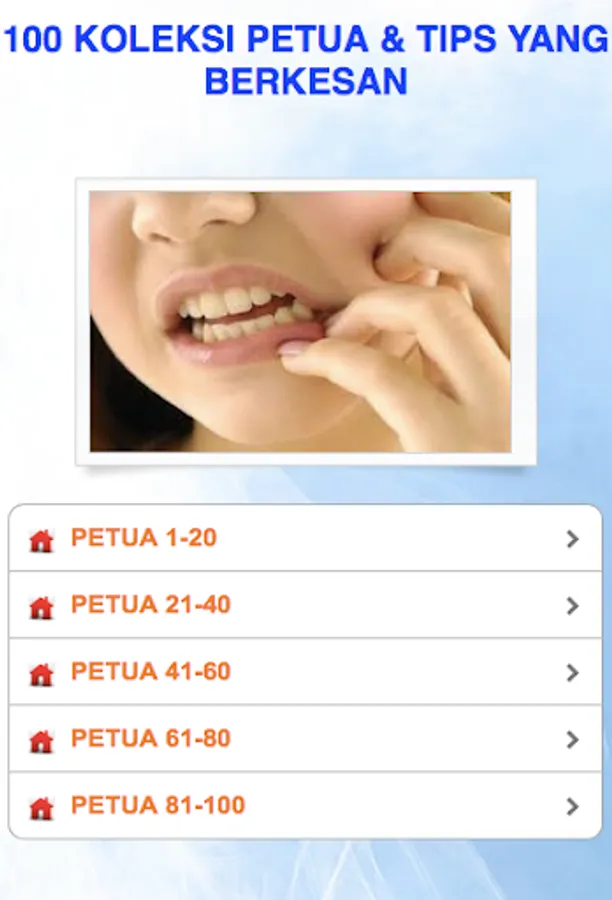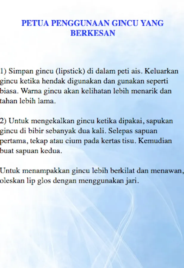 One type - the type of tips in this app is like a toothache cure tips, get rid of fishy fish tips, hints eliminate underarm odor, tips to lose weight, how to whiten skin, nails, how to reduce cough, methods to whiten the face and hundreds more.