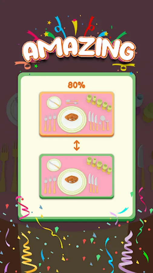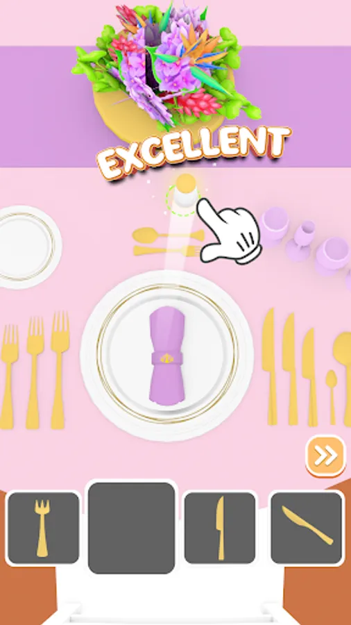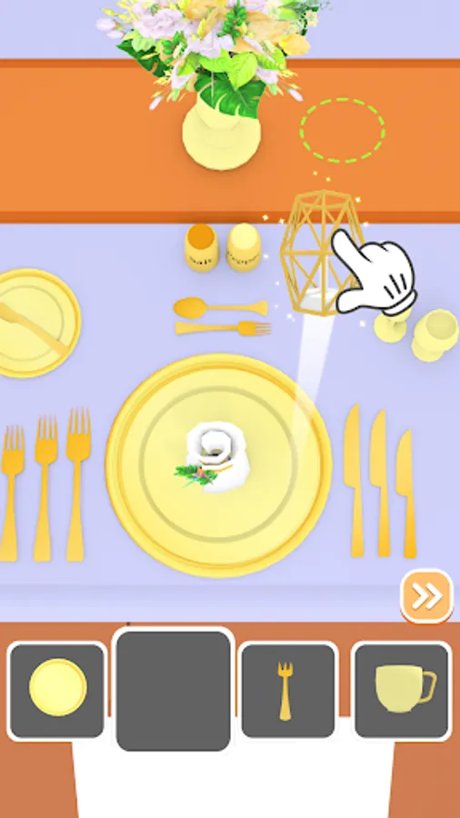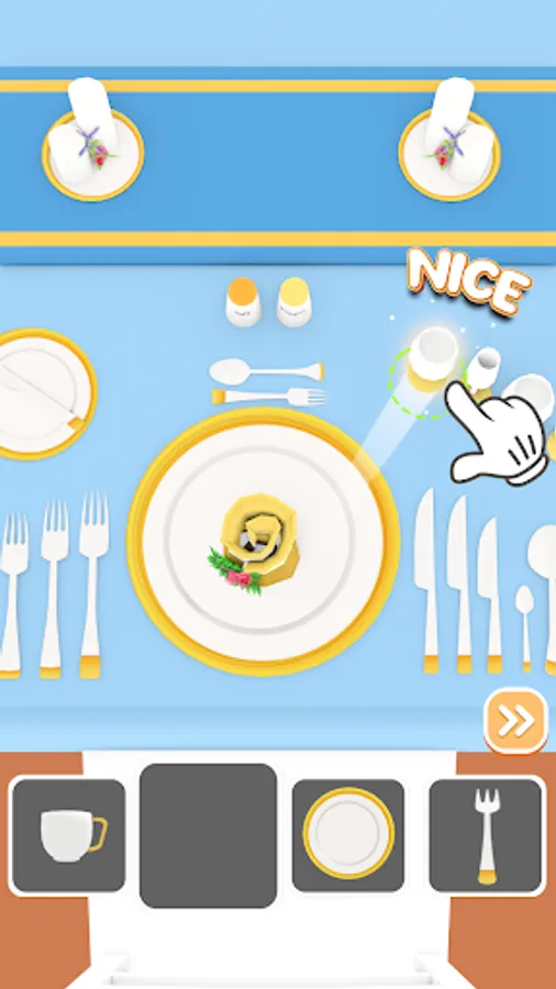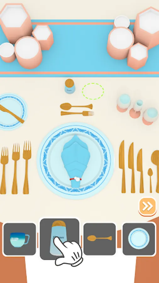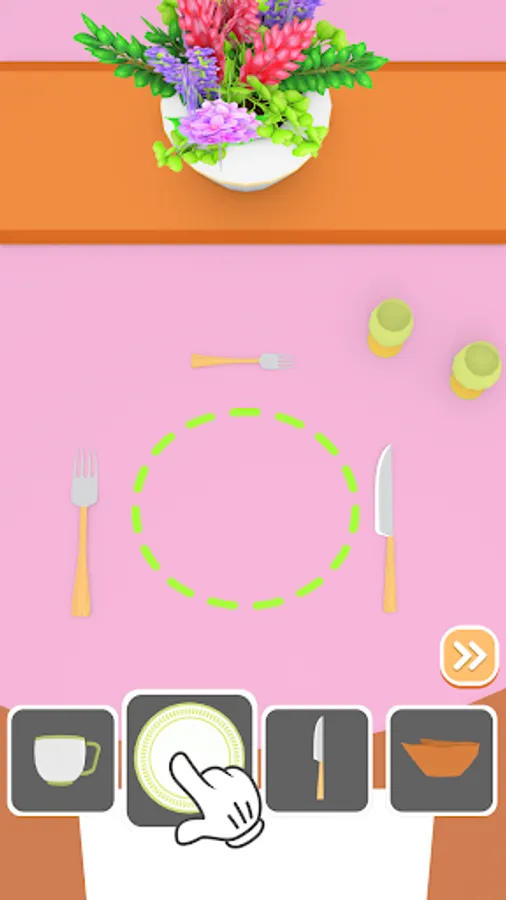 - Drag the items in the stock basket to fill up the table in an American dining table etiquette