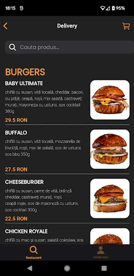 Using the Burger Cart app, the delicious dishes get to you faster and the whole process is so simple! Select the desired dishes from the menu, add to cart, choose the delivery / payment method and send the order - nothing easier! Download now the Burger Cart app to deliver your entire order online in a modern, direct, fast and efficient way!