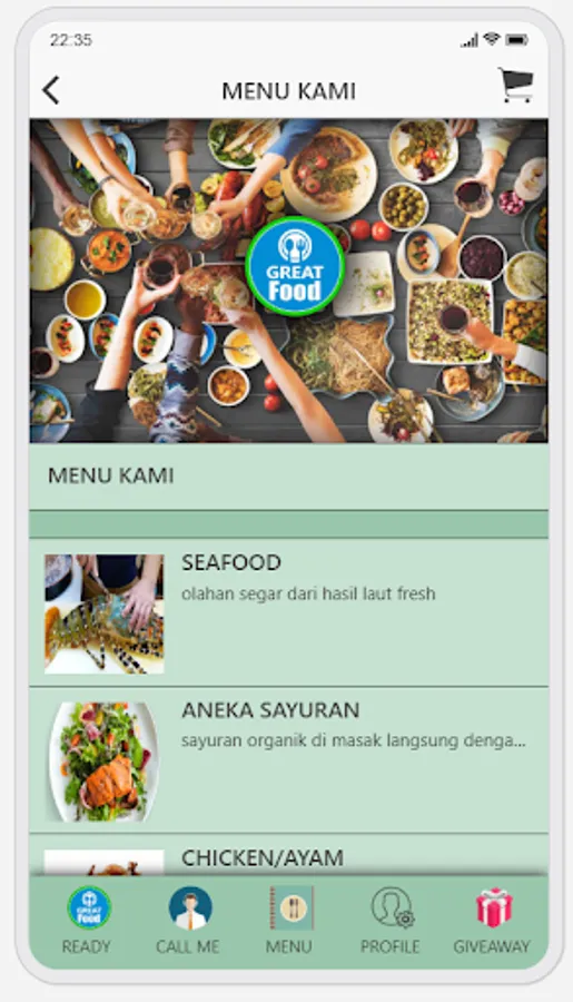 malang great food is one of the branches of greatfood Indonesia which is located in Malang, East Java, in this application provides several food menus that include seafood, vegetables, processed chicken, meat and several other menus that can spoil your stomach.