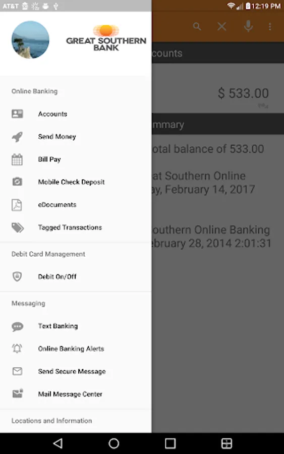 The Great Southern Mobile Banking app serves up powerful tools for Online Banking and Cash Management users*. Online Banking users can easily activate Send Money, Account Alerts, Text Banking, Quick Balance, and Debit On/Off in the app. In addition, Bill Pay and Mobile Check Deposit are available by enrollment.**