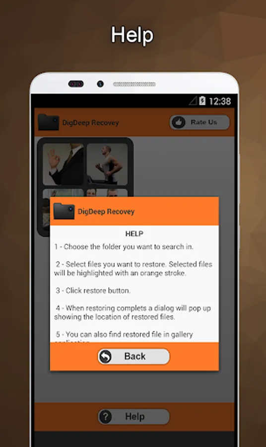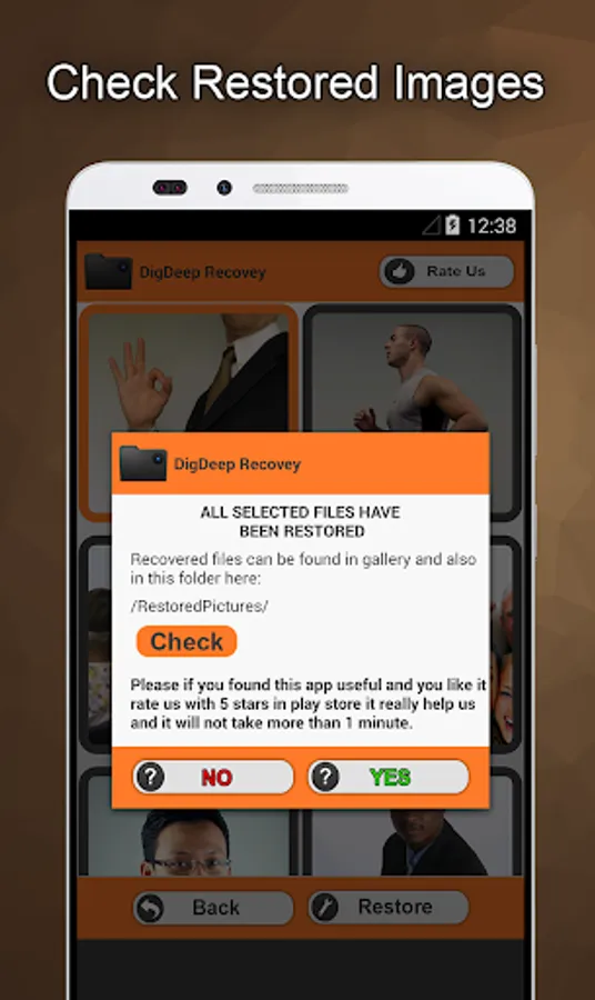 A powerful Recovery tool that Search your internal storage and SD card for deleted images and recover them again easily.