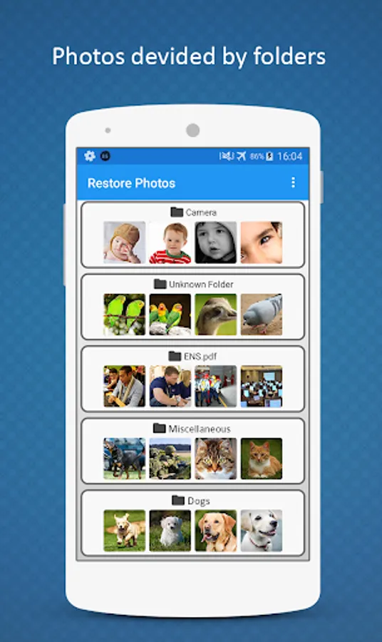 After launching it, wait for it to scan your phone for deleted images witch will take a moment. After finishing scanning it will come up with a list of images broken into folders. Check them one by one to find your lost images.