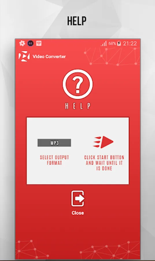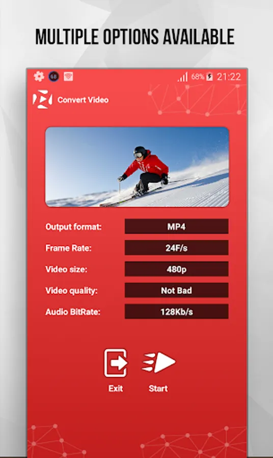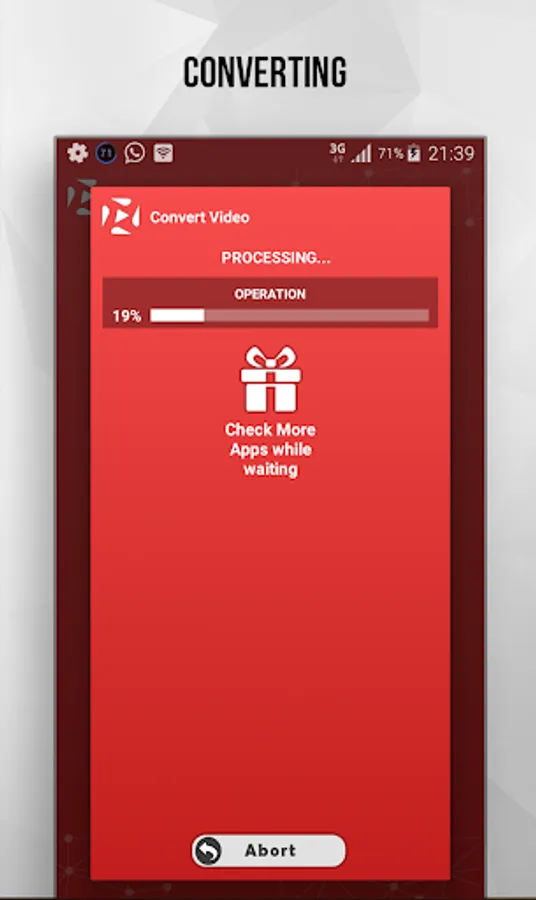 It is simple. Launch the app and press “Convert” Button in the Menu. A new screen will appear where you can choose your video. After choosing. Select desired options to convert with and press convert. A progress bar will appear indicating the advancement of conversion with percentage.
