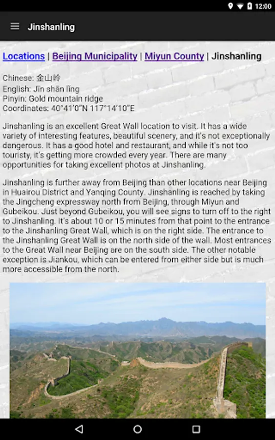 Great Wall Path list - This page lists all Great Wall paths on the map. You can touch a path and it will be displayed on the map.