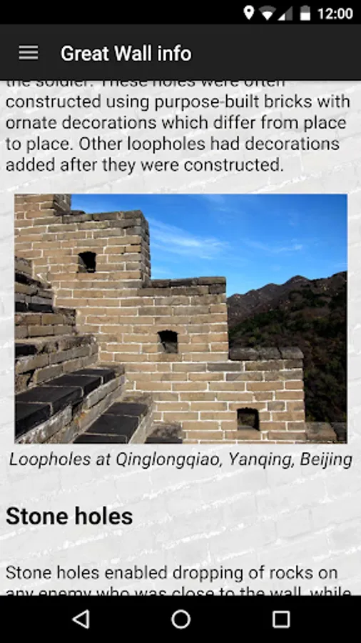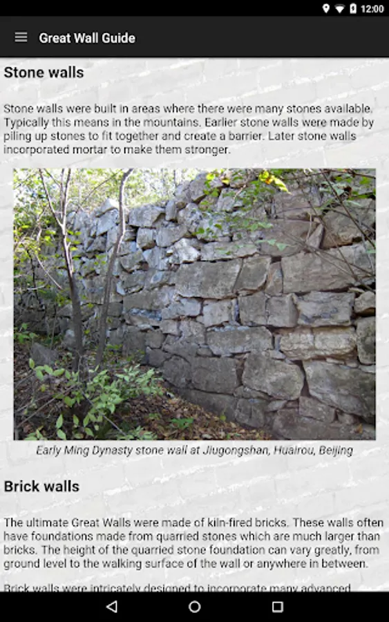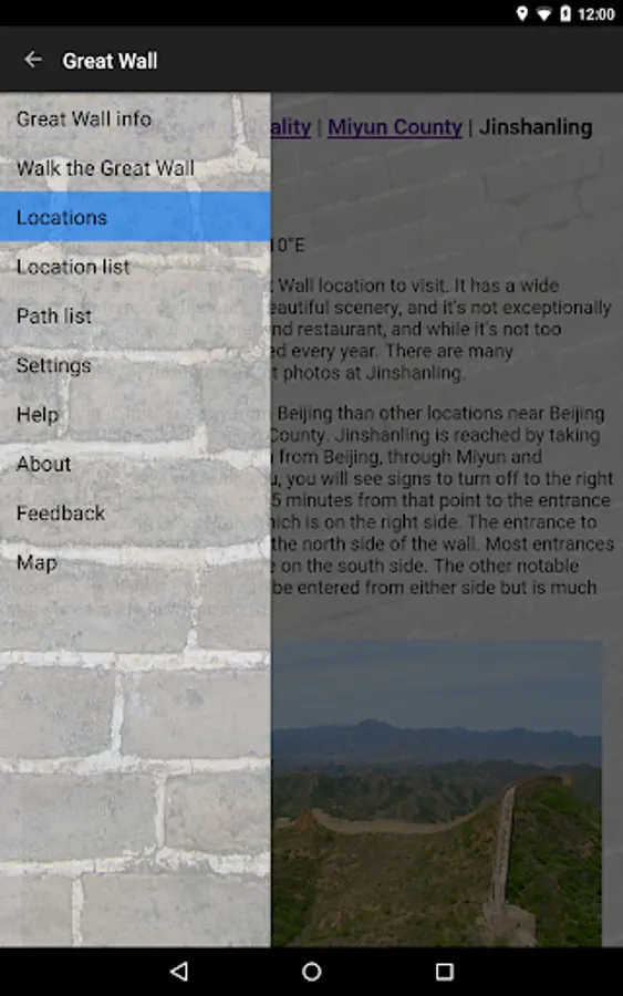 Permissions explained: Great Wall Guide needs access to your location in order to show your location on the Great Wall map. And it needs network and Internet access to show online content.