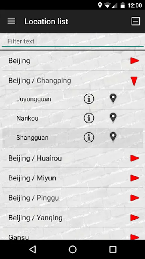 Great Wall Location list - This page lists all locations in the Great Wall Guide. Any location you choose can be displayed on the map or its details page can be viewed.
