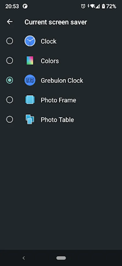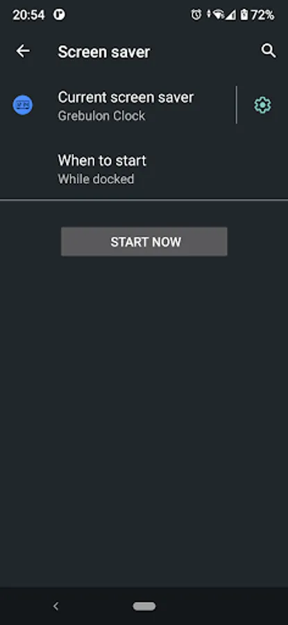 To set-up the screen saver, open the app and click on the settings button. It will take you directly to the phone's screen saver settings. Alternatively open Android's settings -> Display -> Screen saver.