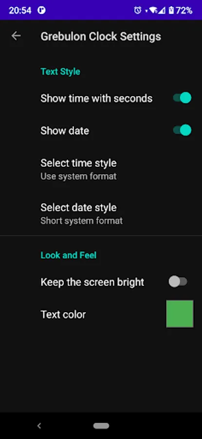 Select "Grebulon Clock" and click on the gears icon to customize it. You can change the color, the time and date format (date can be hidden) and opt to show the time with or without seconds.