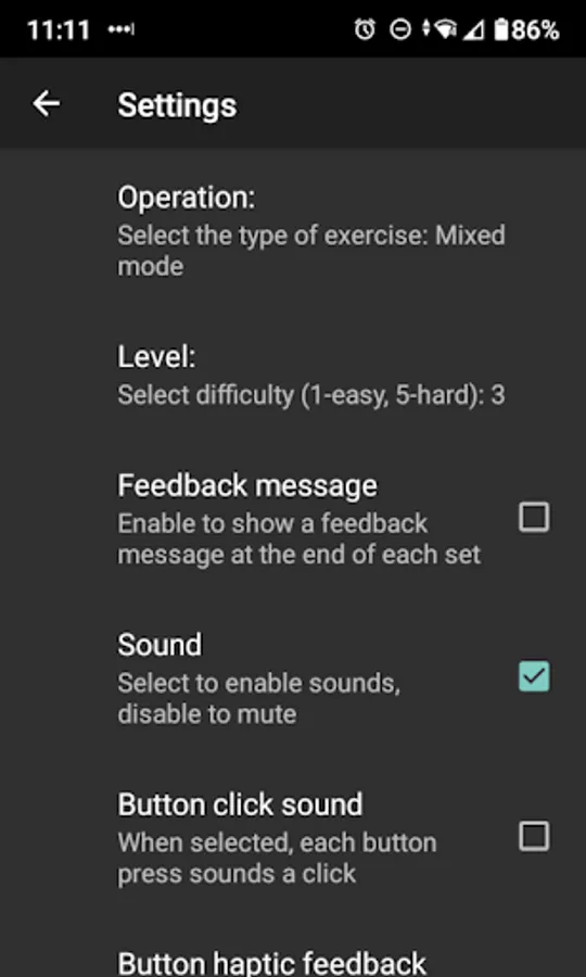 Enter your answer by pushing the number keys. If you're right, the next problem will be presented. If you're wrong, "ERROR" is displayed. You're given two more tries, then the correct answer is displayed. After ten problems, your score - the number of right answers and the time it took to solve, are displayed. A feedback dialog will rate you with 1 to 5 stars. Then another set of ten problems begins with the same operation at the same level.