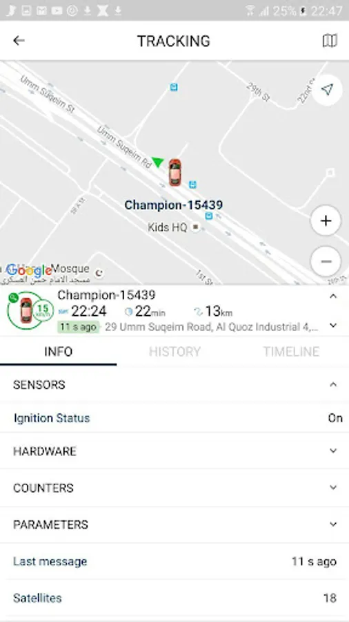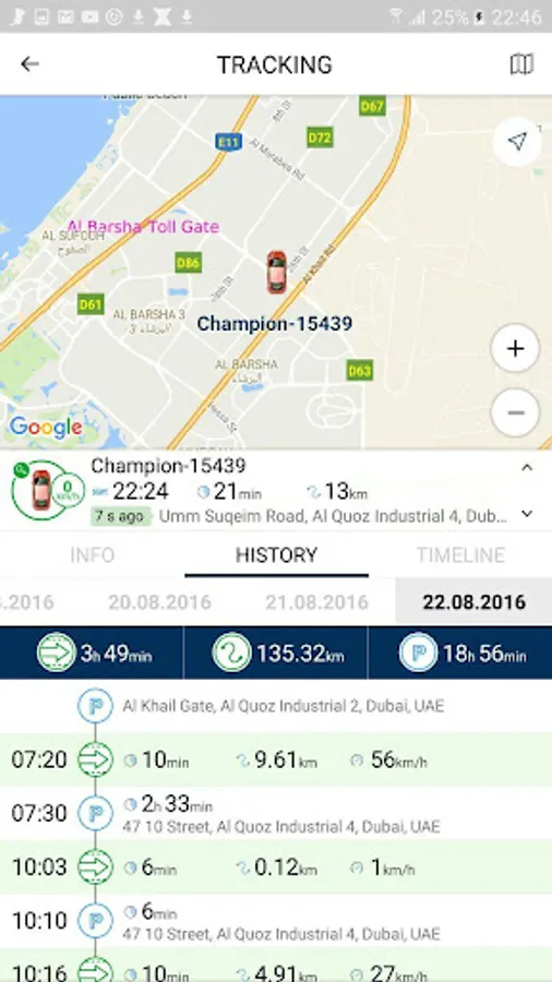 The details of vehicle movement is shown in the HISTORY tab which can be expanded by swiping the screen up in the same view. Trip details such as when and where the vehicle was started, the distance traveled, when the vehicle was stopped, how much time it was parked etc are all shown in the expanded view. A click on any of the trips will draw the route travelled by the vehicle during that trip on the map with start and finish flags. Amazing! Isn't it?