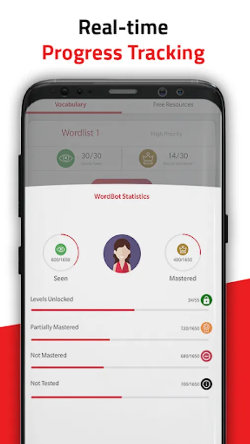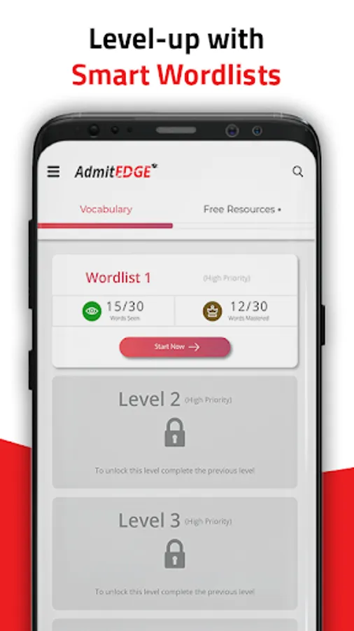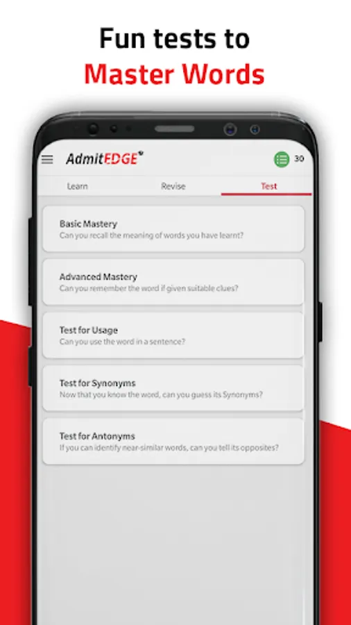 Take up a series of tests strategically placed at the right intervals to boost your GRE verbal reasoning. You can unlock the next wordlist only if you master 15 words to make sure you get the best GRE English practice. This ensures that you retain the words you learned in the previous section and learn each word from all the GRE 1650 word list with this one of a kind GRE vocabulary app.