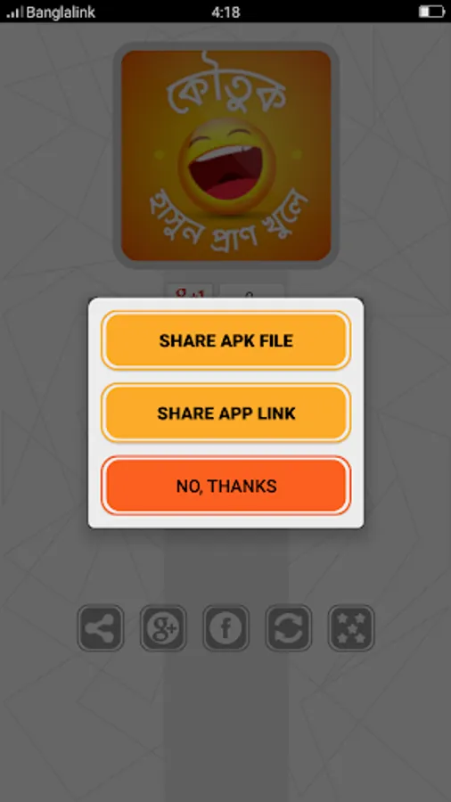 Bangla koutuk which is Bengali trick and bangla Jokes app is brought to you by Green app studio. This Mojar Koutuk application will gives you lots of pleasure which means entertainment. Human life is incomplete without hasir jokes and hasir golpo. If you are sad the read the joke we can give guaranty of your satisfaction. In this application there is a box and which is full by hasir koutuk and hasir golpo. This is one of the best hasirr app in Bangladesh. We do not belive in jokes for adults bangla because this is not a clean entertainment its one kind of sin. We belive that this kind of worst app can not bring happiness and as a muslim you should avoid this. You can use the content of jokes bangla app as a facbook status and hasir sms / bangla sms with your friends and brothers. They will enjoy a lot. Jokes is kind of comedy so this bangla kooutuk is full of comedy. Read your app when you are sad, bored and share the mojar koutuk with your friends. And the most important this do not forget to review this app it inspire us to build more app for you. Enjoy the Bengali trick and Bengali jokes.