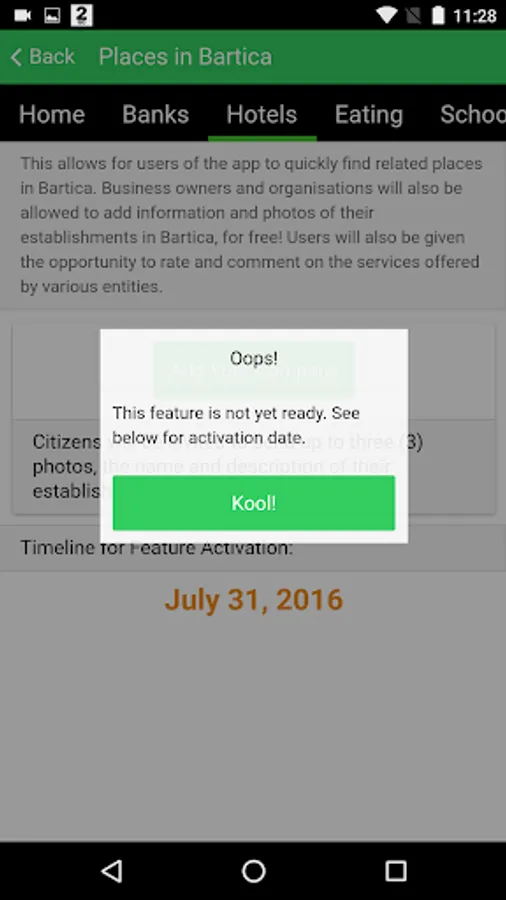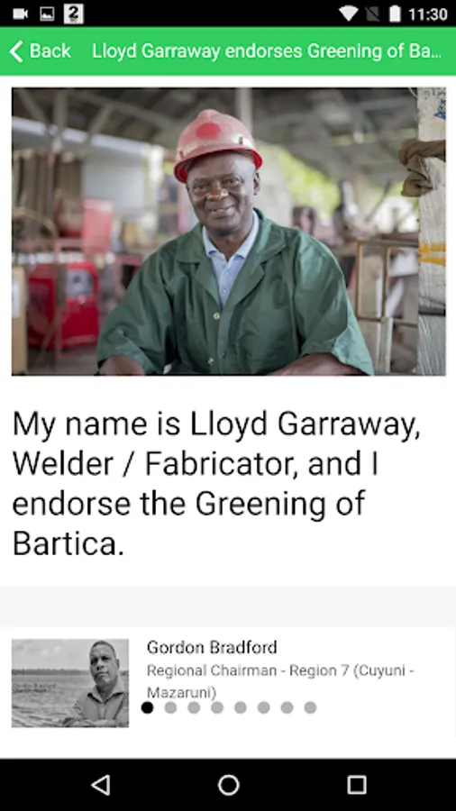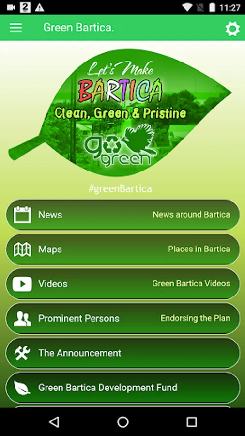 The idea of the Green Bartica App is to provide a platform that would nationalize and internationalize the H.E. President David Granger's initiative of making Bartica Guyana's first Green Town. Through this App, we hope to motivate, inform and persuade citizens within Guyana and the diaspora to contribute to the greening of Bartica. The Bartica Town Council welcomes your support in maintaining the platform.