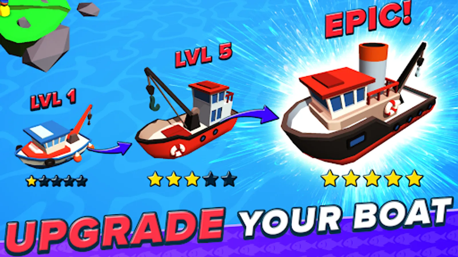 You can upgrade your boat upon catching the needed amount of fish in this idle tycoon. Each fish type provides you with a particular amount of money and XP points – the rarer, the faster, and the bigger, the more expensive both money and experience-wise in this fishing simulator. These upgrades increase your chances of catching some of the most agile fish.