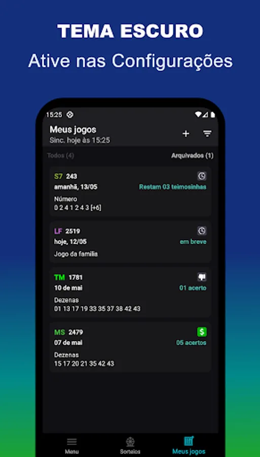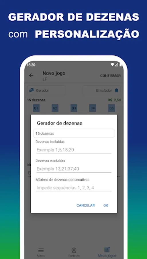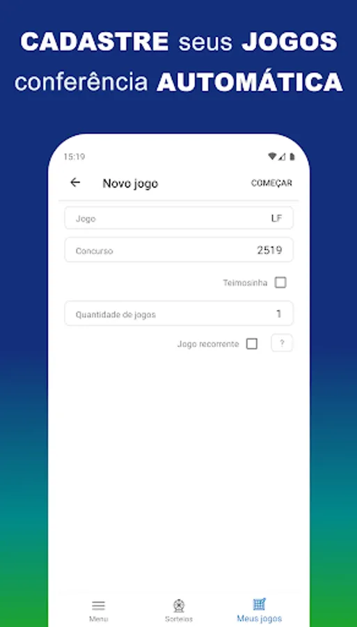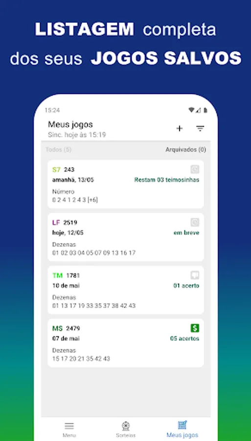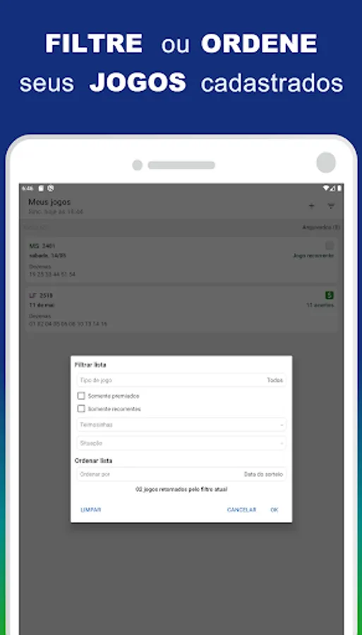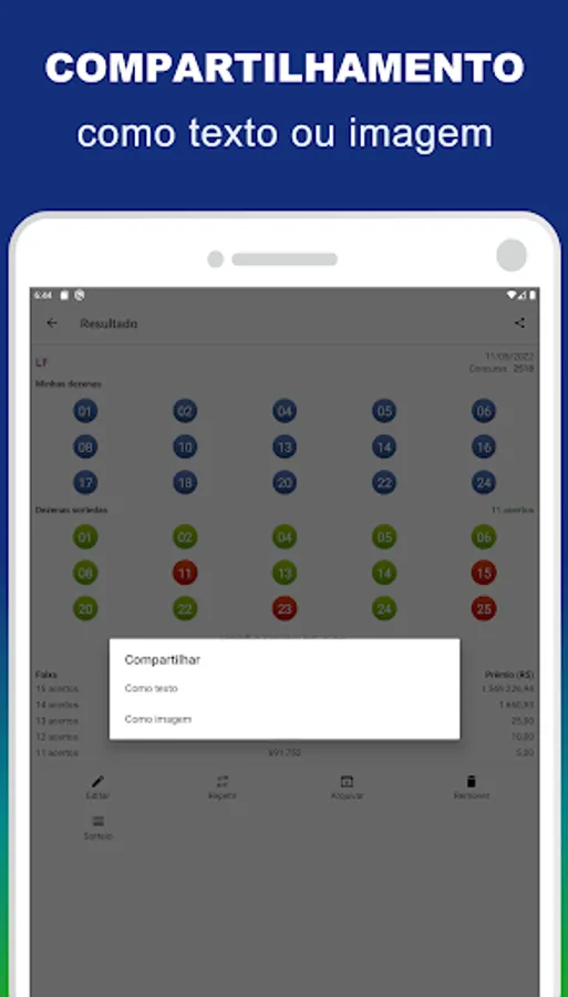 Register your games and the app will check your successes and the prize you should receive. All current Lottery modalities are available. When filling out a game, discover in real time what the value of the bet will be according to the selected tens.