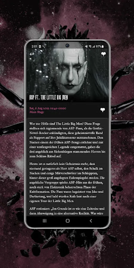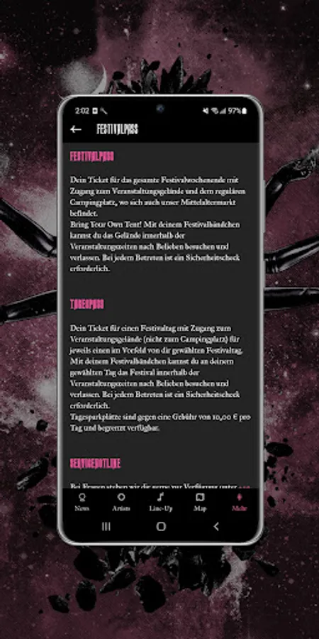 Welcome to the dark side! In the M’era Luna-App you’ll find everything you need on site: Area plans, a camp anchor to find your tent, personal timetable with integrated gig-alert, and a newsfeed with all the important information of recent events. The whole M’era Luna Festival on your smartphone!