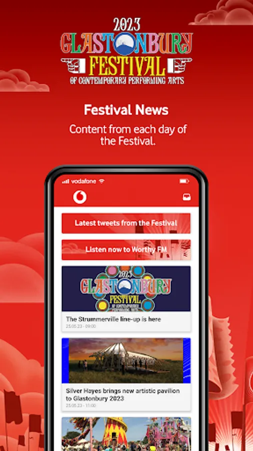 - A news feed with the latest updates and app notifications from Glastonbury, including the Festival's live Twitter feed powered by Vodafone and new for this year, a live streaming link to Worthy FM radio station.