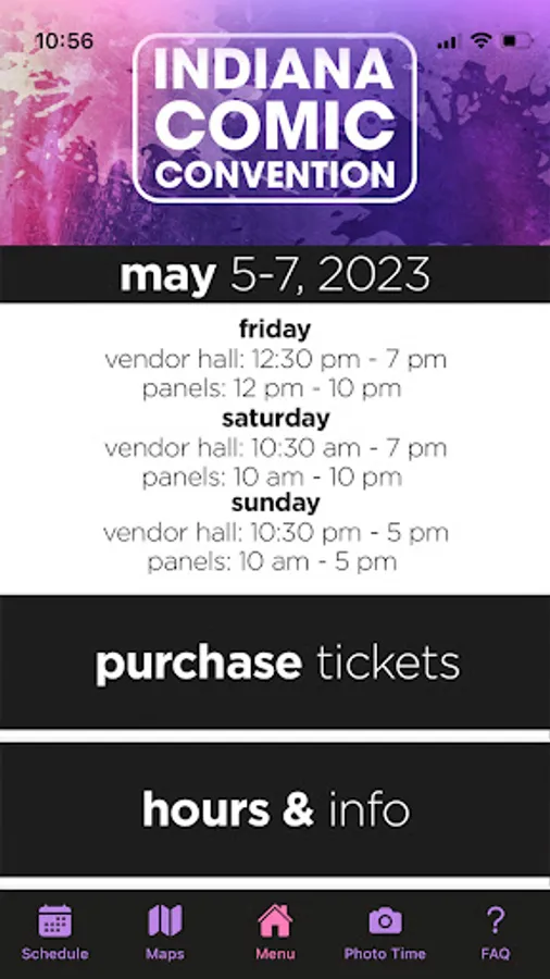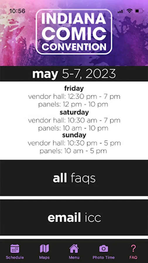 The Indiana Pop Culture and Comic Convention app is your road map to all things ICC! Download the app prior to the event for updates on guests, the event, tickets, Photo Ops, and easy access to our FAQ. Have your schedule ready by adding panels and Photo Ops to your app when times are announced. The app will help guide you during the show by giving you information about Panels, Photo Ops, Tickets, Celebrity Row, Vendor Floor, and more We can't wait to celebrate pop culture and comics with you on May 5-7, 2023 at the Indiana Convention Center.