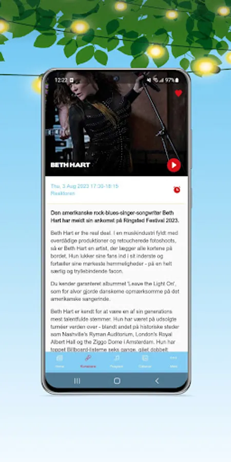 The app is a shortcut to everything you need when you go to Ringsted Festival. Here you can see which artists are playing at this year's festival. You can see when they are playing and on which stage. You can give your favorite artists a star - then you will receive a notification before their concert. Press the music icon and hear a taste of the artists' hits.