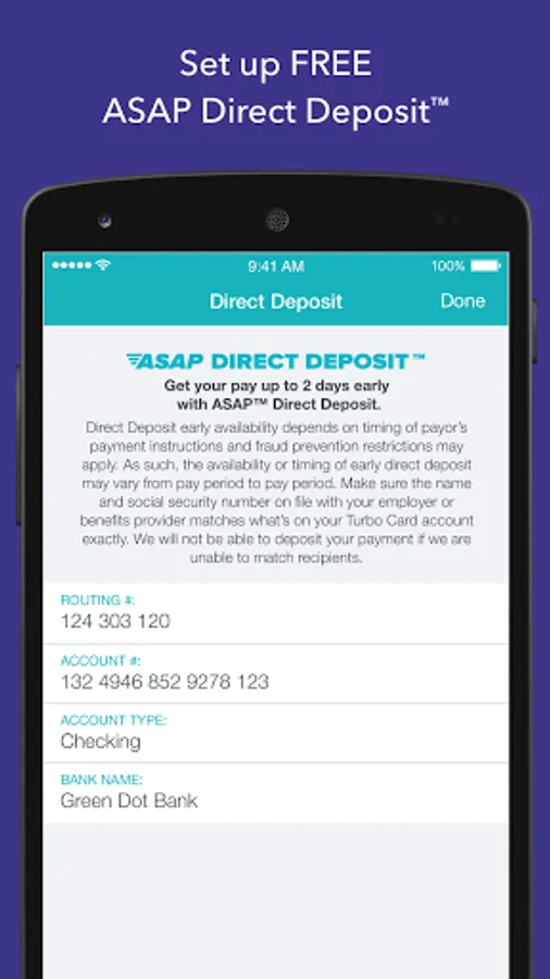 **Direct Deposit early availability depends on timing of payor’s payment instructions and fraud prevention restrictions may apply. As such, the availability or timing of early direct deposit may vary from pay period to pay period. Make sure the name and social security number on file with your employer or benefits provider matches what’s on your Green Dot account exactly. We will not be able to deposit your payment if we are unable to match recipients.