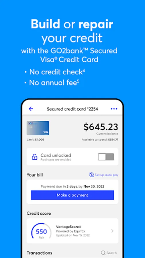 With the GO2bank Secured Visa® Credit Card, climbing to better credit is easier with no annual fee⁵, no credit check⁴, and no impact to your credit when you apply.