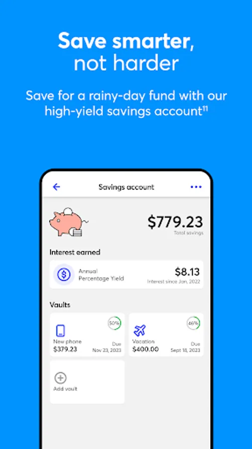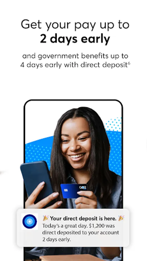 When it comes to payday, early is right on time. Get your pay up to 2 days early and government benefits up to 4 days early with direct deposit⁶. Need cash? Withdraw for free at our free nationwide ATM network⁷. Want to save? Earn more with an APY well over the national savings rate average¹¹.