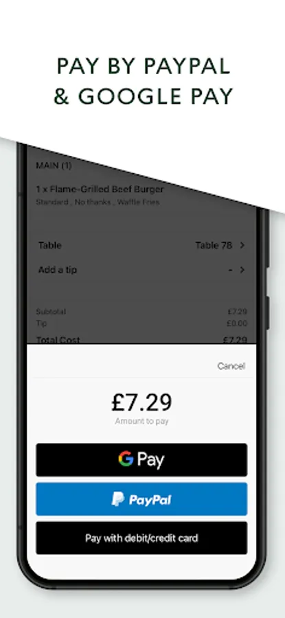 Discover our food and drink menu directly in the app, and order from your table, so no need to get up and queue. Payment is simple, you can use either PayPal, Google Pay, or scan your card. You can apply discount codes* when you check out.