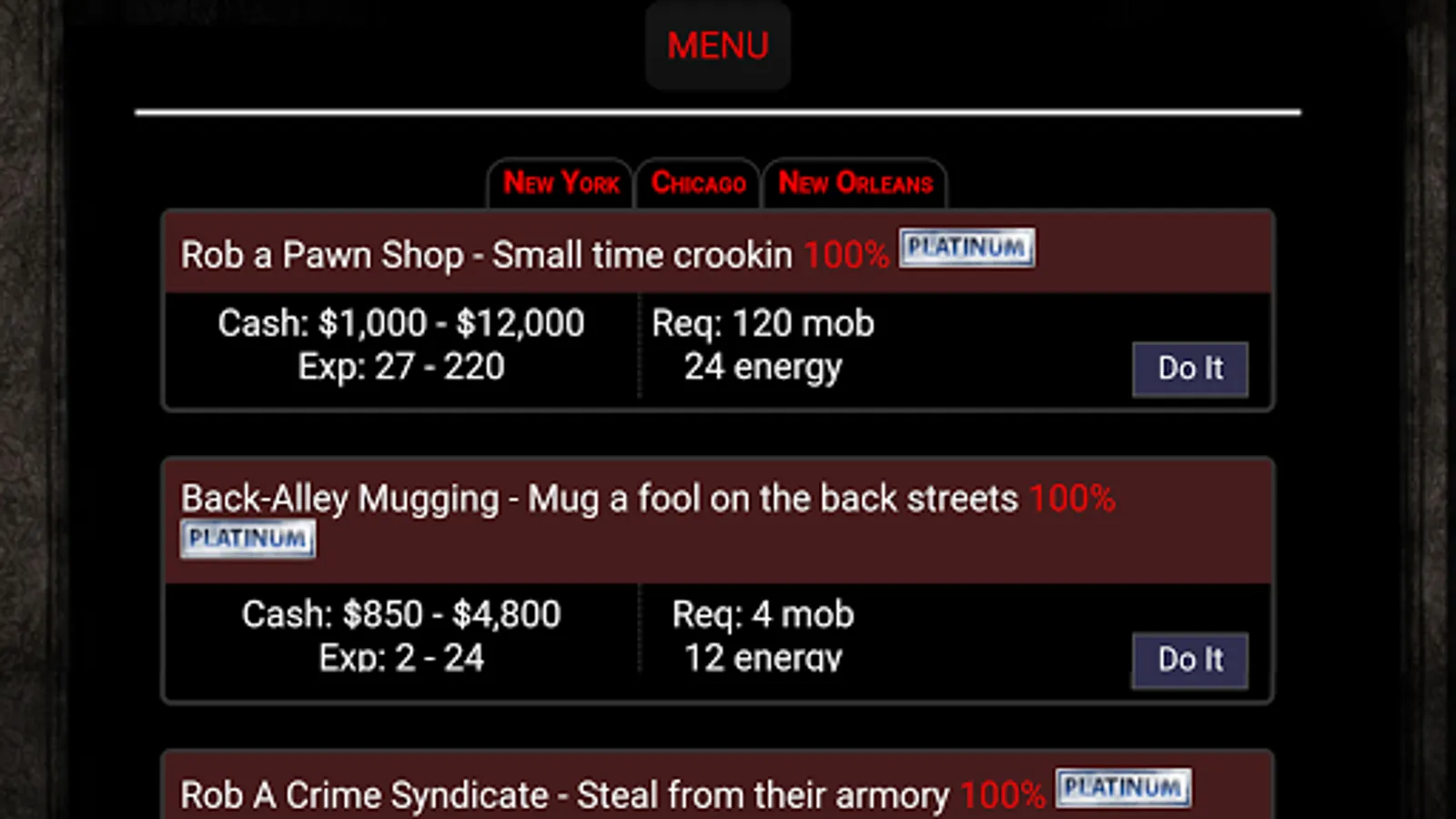 Mob Up! Join one of the many mob families or create your own. We have LOTTOS, personal stat page, SPECIAL HOLIDAY DROPS return energy feed, fight log, GALA, theres too much to list! Customize a male and female avatar endlessly with new items released every week. Unique missions with item drops get new players started and help seasoned players advance further. Collect your daily bonus for knuckles and points and more. Classic gameplay and an "all players and platforms" social broadcast chat makes for an easy start. Ask players or administrators in chat about gameplay and simply click "add" next to names to add mobsters to your mob. Top mob them to get and send energy and collect their cash bonus daily. Easily make the mobile Made Men list with the newly released app for android. So take back an old mobs name and dust off the flasher, our great original mobsters community is here!