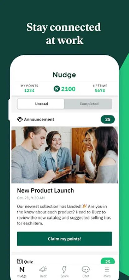 Bite-size communications, called Nudges, keep you up-to-date and in-the-loop on new information. And every time you read and respond to an announcement, survey, or quiz, you’ll earn points. Be sure to answer all of your Nudges to climb to the top of the scoreboard!