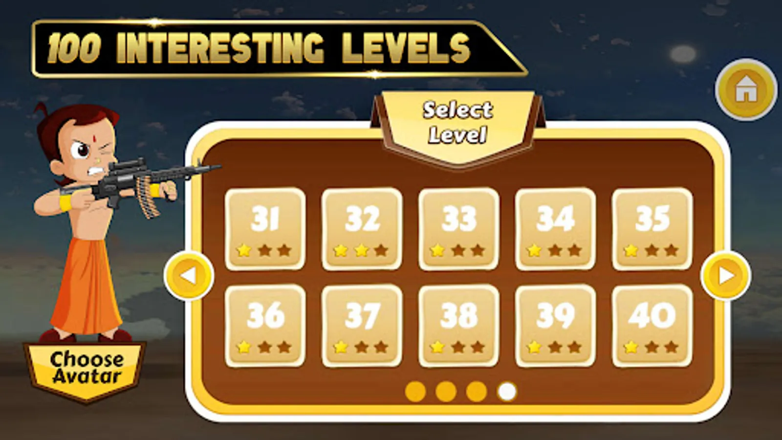 Bheem faces many villains who are trying to take him down, he needs to shoot them down and progress to finish line. Currently this game has 99+ levels and more will be added soon..