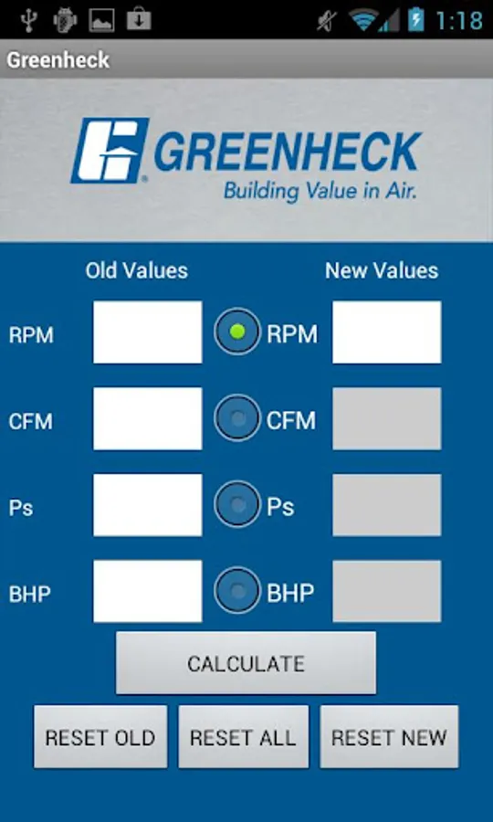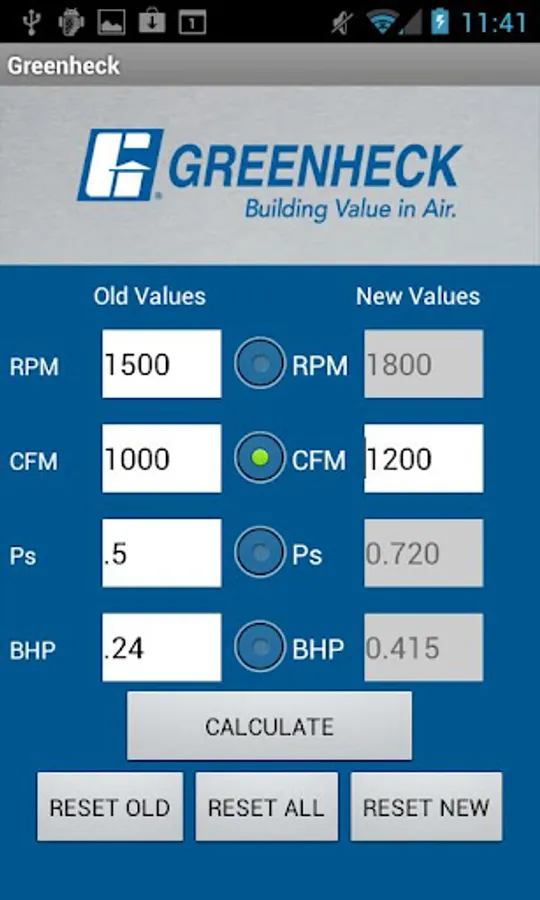 Greenheck Fan Law Calculator gives you the capability to quickly determine new flow rates when performance changes need to be done to an existing unit. Simply input the existing specifications for rpm, cfm, static pressure, and horse power. Next input the desired performance (cfm or rpm) and the remaining values will automatically calculate using standard fan laws.
