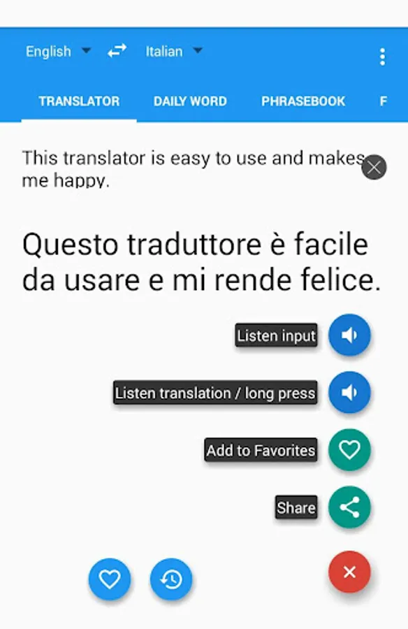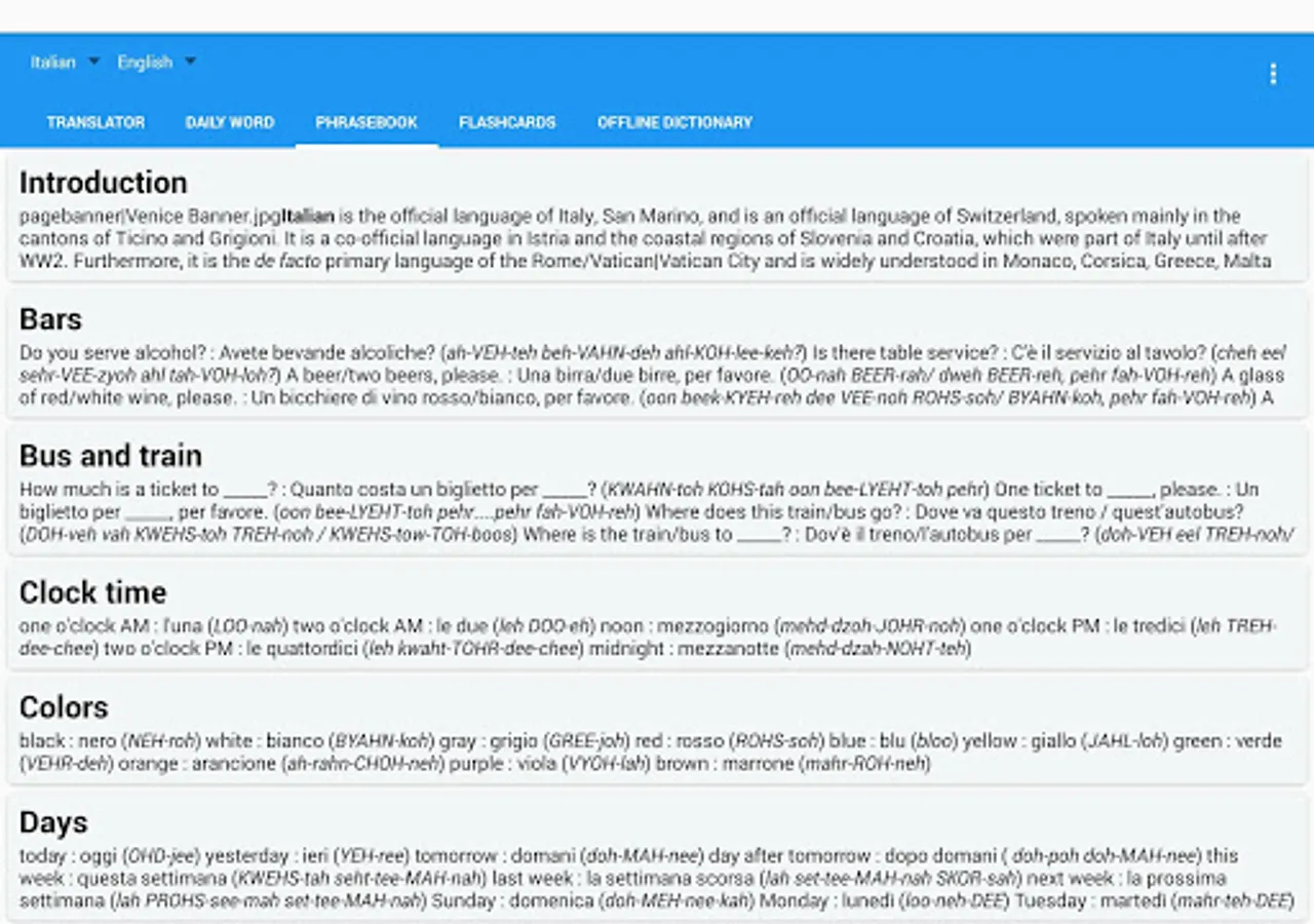Supports Translation in 50+ languages. Learning with talking translator is like reading a Italian book to learn Italian pronunciation and improve Italian speaking skills. You can study English or study Italian.